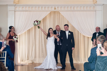 Guests arrived to find a truly elegant venue, decorated with white, gold, and silver accents and candles illuminating throughout. The couple chose to have their ceremony inside the ballroom with floor to ceiling windows just as the sun was setting.